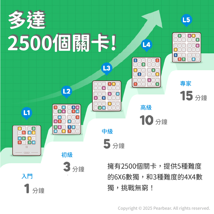 ・提供2500道題目,涵蓋5種不同難度的6x6數獨與3種難度的4x4數獨,適合所有年齡層